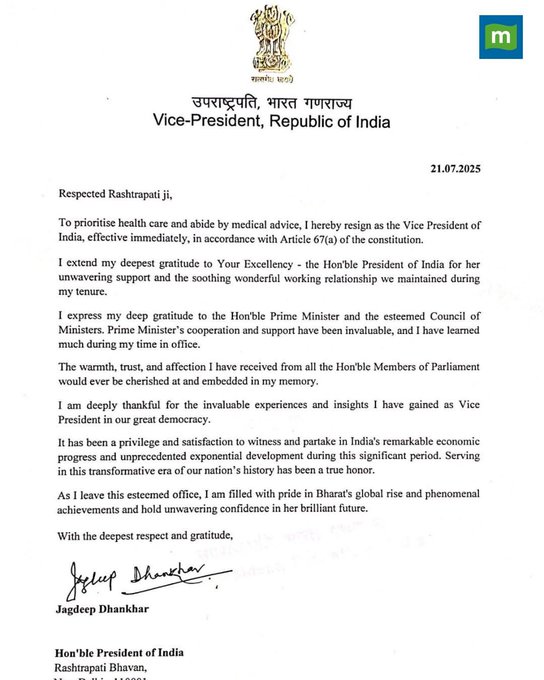 રાષ્ટ્રપતિને લખેલા પત્રમાં તેમણે લખ્યું હતું કે – “સ્વાસ્થ્યને પ્રાથમિકતા આપીને અને તબીબી સલાહનું પાલન કરીને, હું તાત્કાલિક અસરથી ભારતના ઉપરાષ્ટ્રપતિ પદ પરથી રાજીનામું આપી રહ્યો છું.” સાથે જ તેમણે પત્રમાં રાષ્ટ્રપતિનો તેમના સહયોગ અને સૌહાર્દપૂર્ણ સંબંધો બદલ આભાર માન્યો. તેમણે વડાપ્રધાન અને મંત્રીમંડળનો પણ તેમના સહયોગ બદલ આભાર માન્યો.